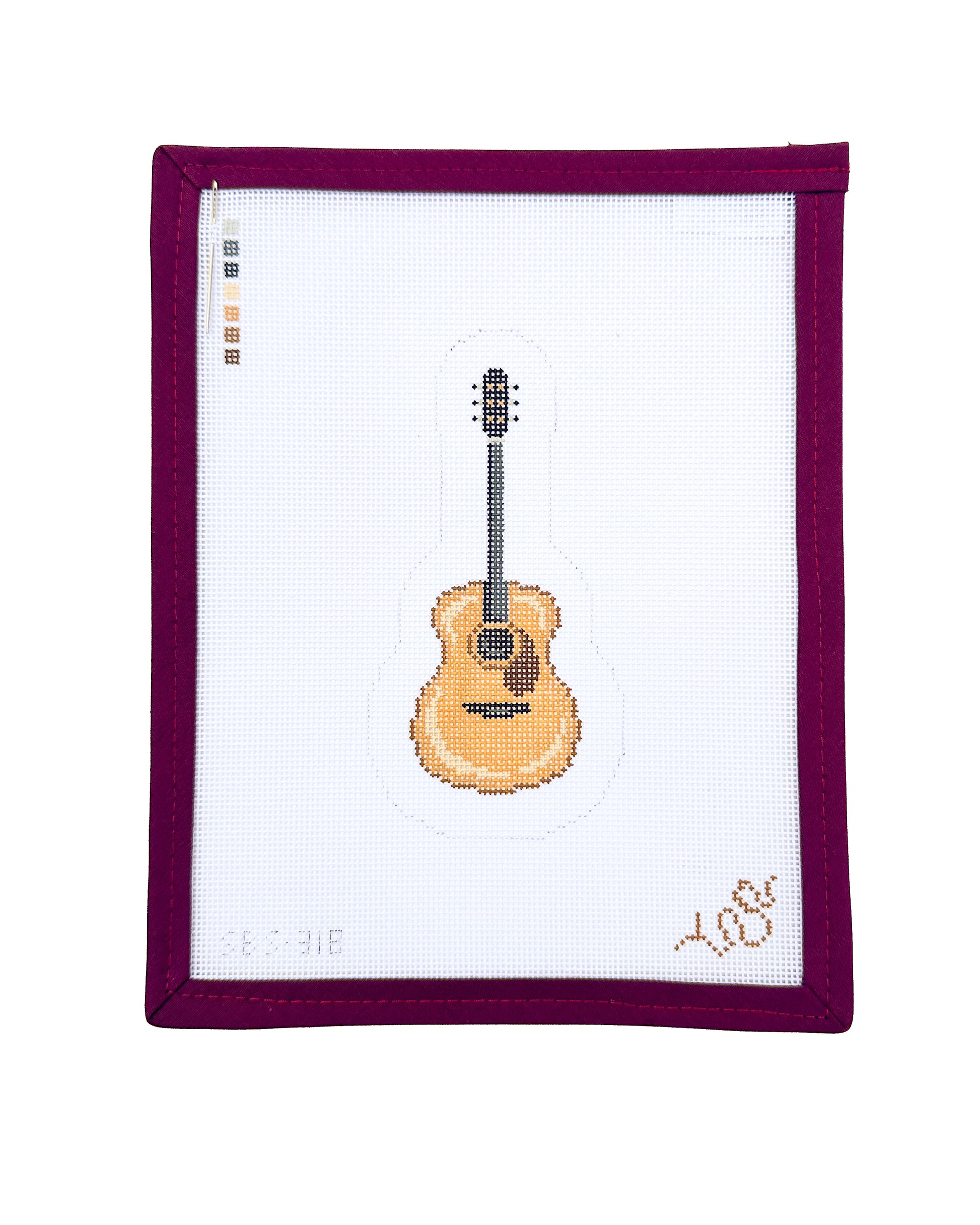 The acoustic guitar design is 2.7x5.2" hand painted and stitch painted on 18 mesh. Dimensions include outline. Please note that the strings are NOT painted onto the design. I suggest adding strings once the canvas is all stitched by using long stitches with a fine piece of silver thread done on top of the base layer of tent stitches. I used DMC diamant thread in silver, split into tiny strands. The effect this gives is so lifelike!
