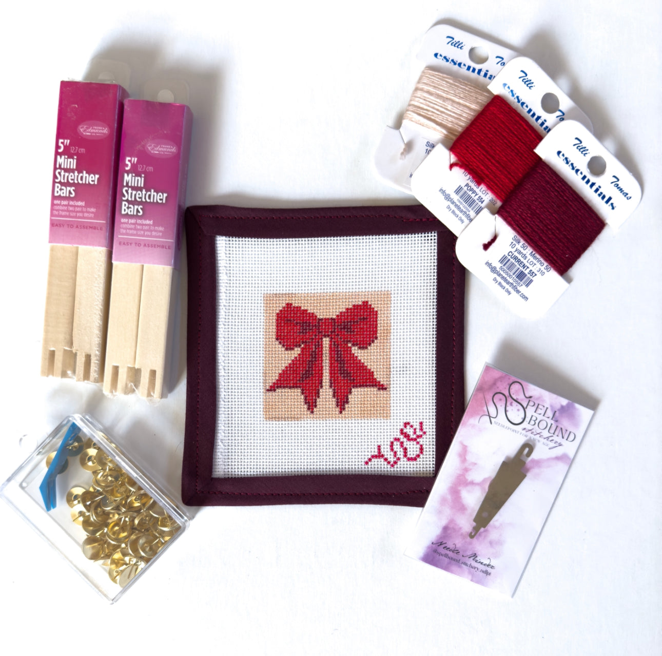 Can be kitted to include threads, stretcher bars, tacks, and a needle threader and mini needle minder.
