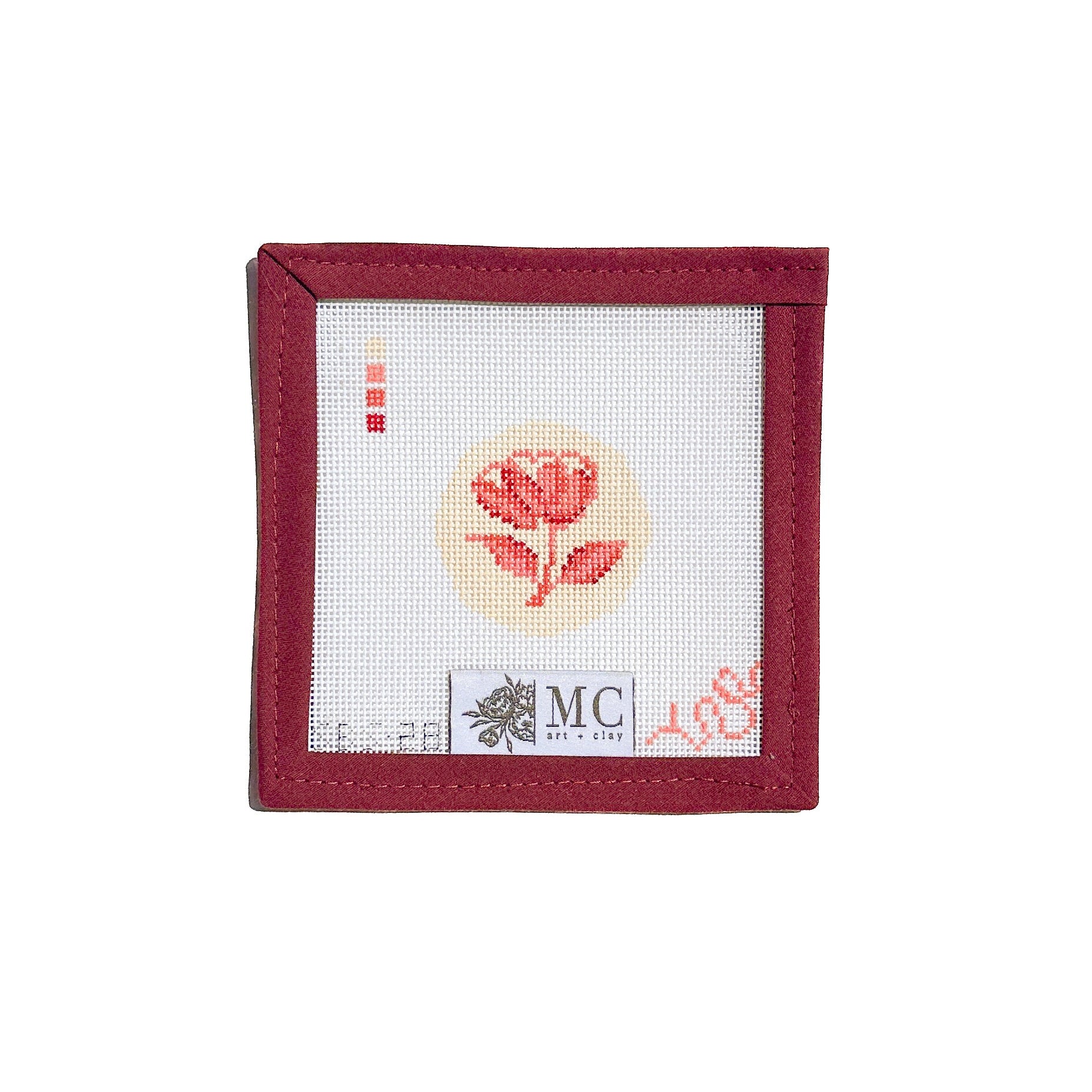 This flower charm in blush is 2" round on 18 mesh, hand painted and stitch painted. The perfect accessory and a quick stitch!