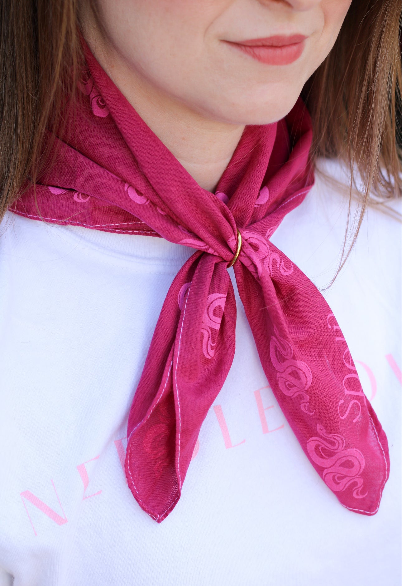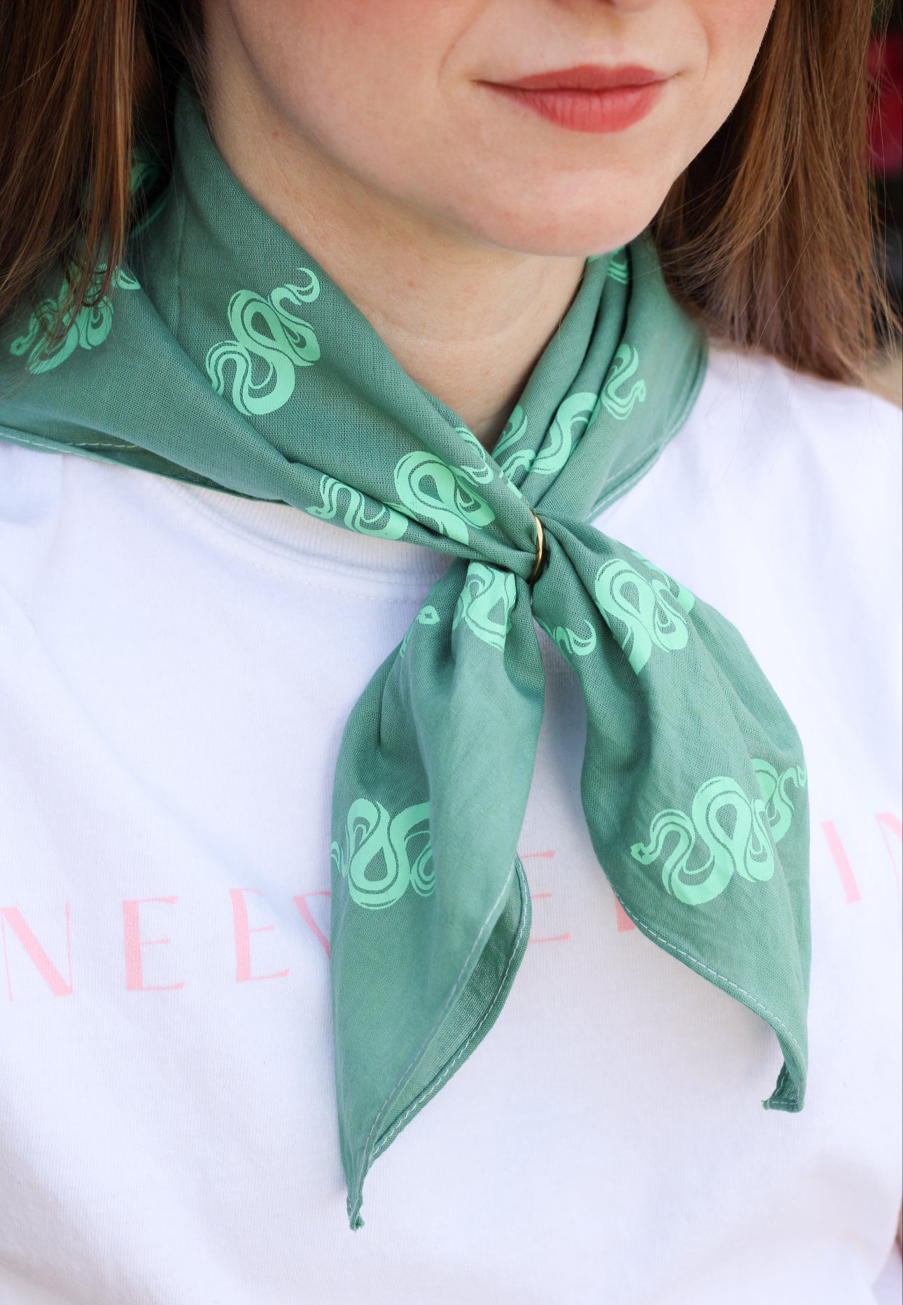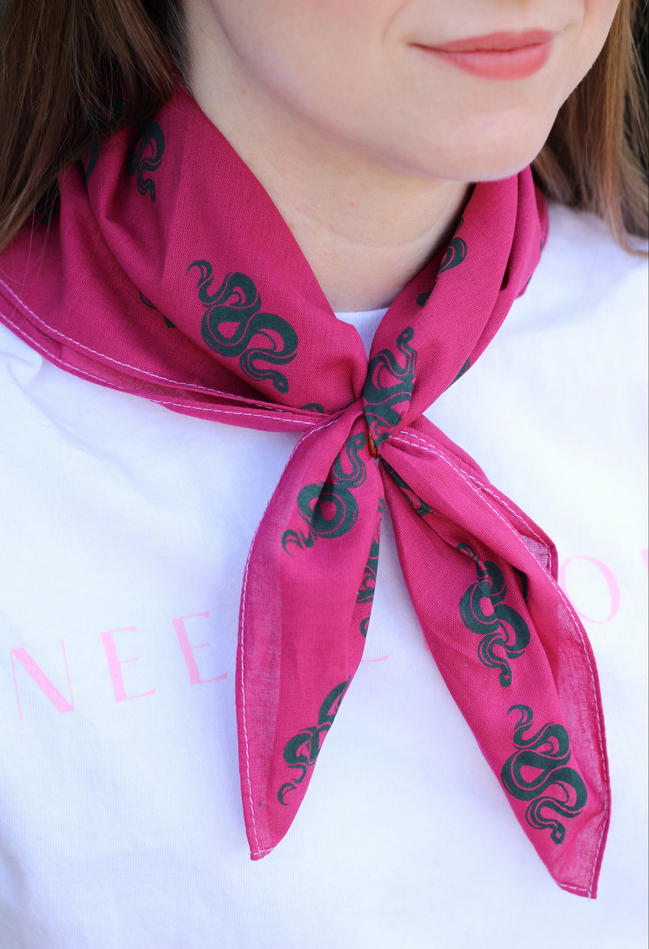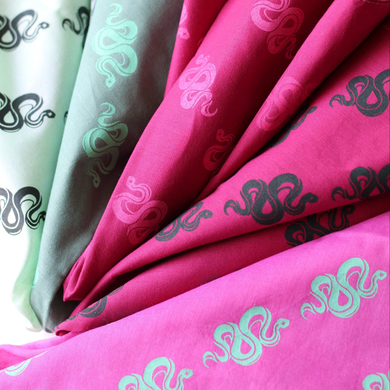 The Spellbound bandanas feature a repeating pattern of the Spellbound snake logo in these five fun color ways. All bandanas are hand dyed with custom colors, lovingly crafted by Christian Wash Garvey for Spellbound Stitchery.