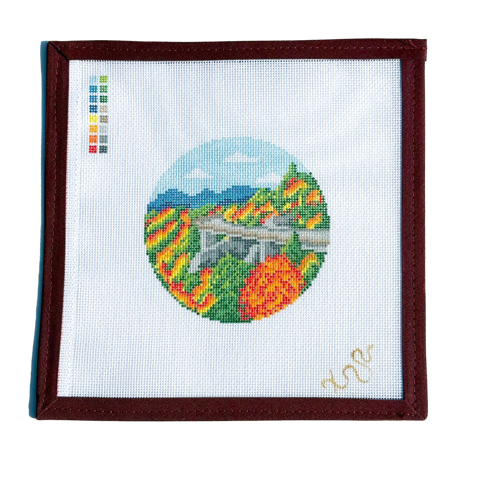 Grab your needle and express yourself with this 4” round needlepoint canvas, featuring the iconic Linn Cove Viaduct on the Blue Ridge Parkway. Each canvas is hand-painted, showcasing the breathtaking beauty of fall leaves.