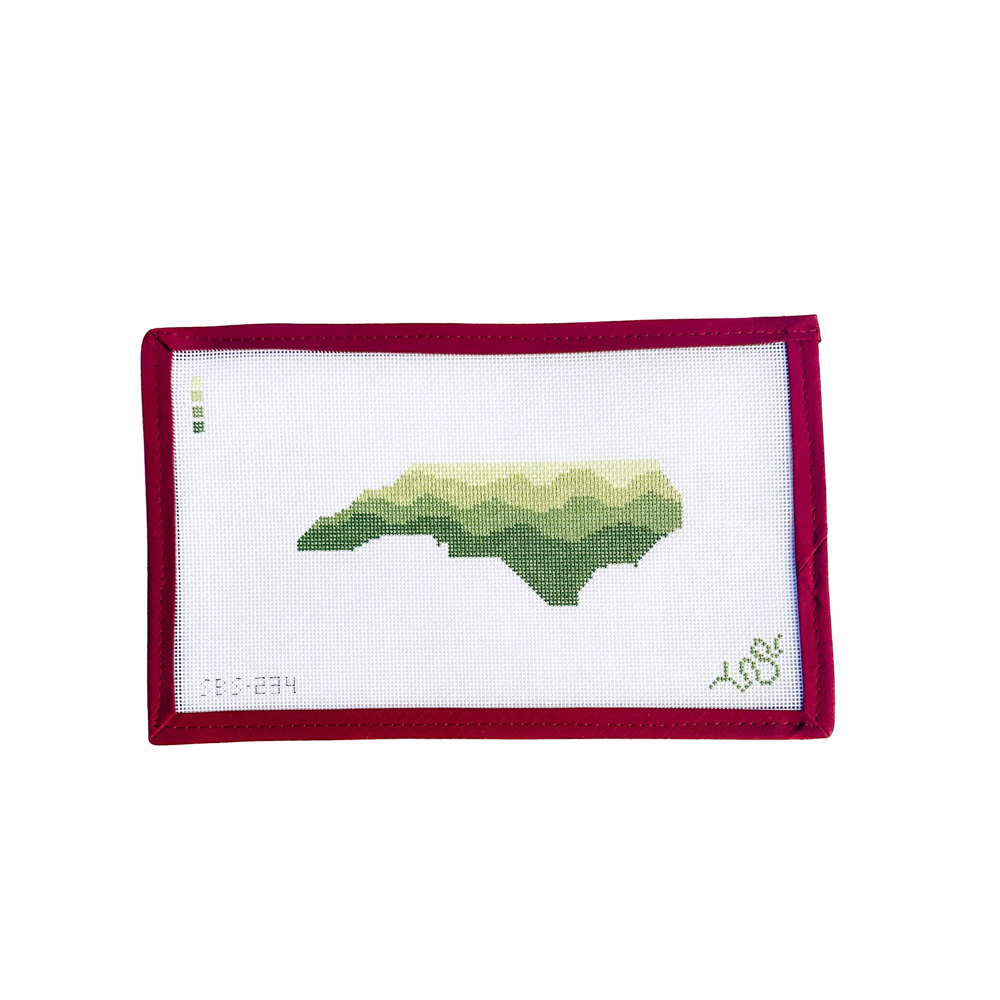 The North Carolina canvases are painted and stitch painted to a size of 5.6"x2.1" on 18 mesh. Stitchers are encouraged to add a 1/2" border around the design to aid with finishing.