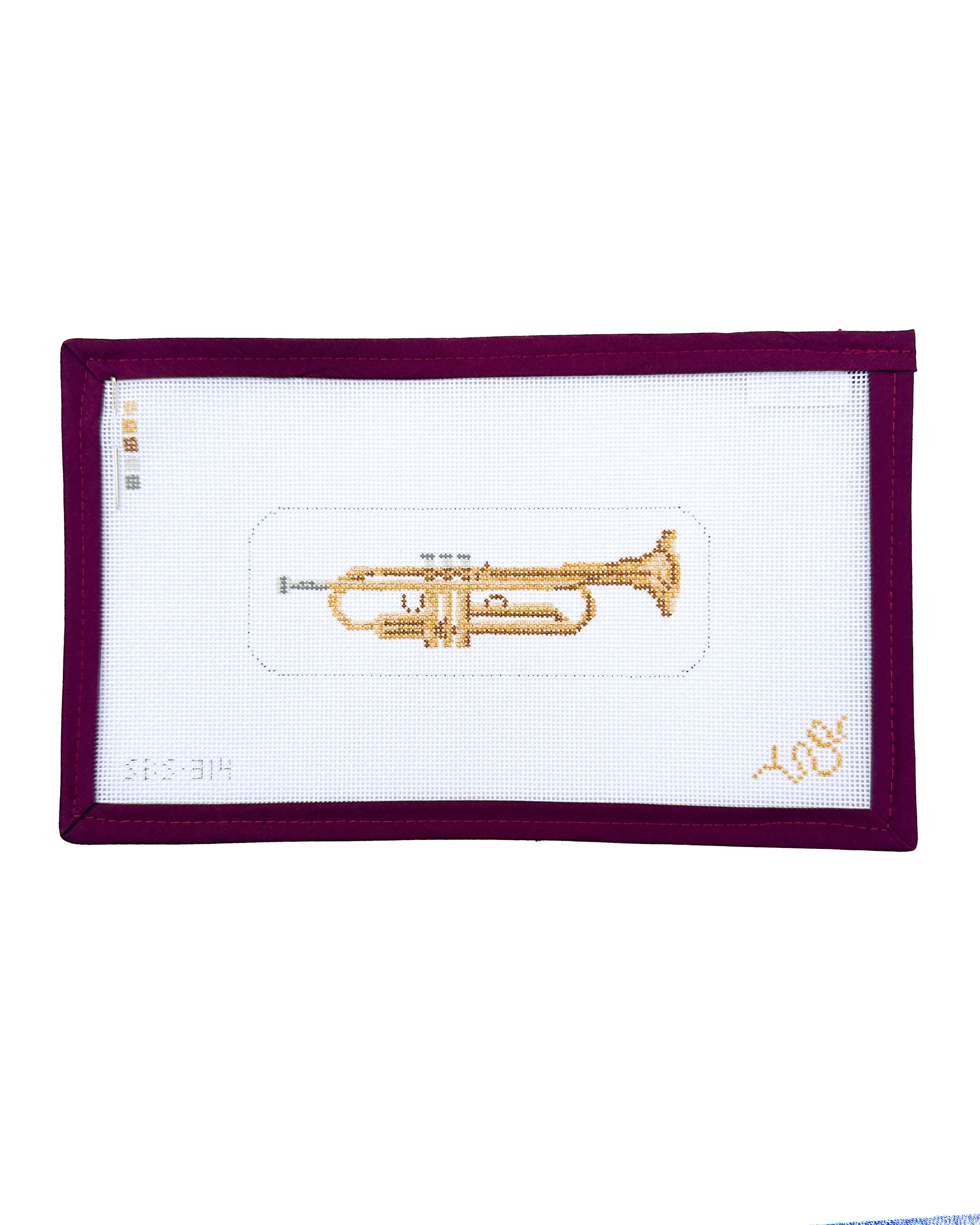 Trumpet needlepoint design is 5.5x2" hand painted and stitch painted on 18 mesh. Dimensions include outline.