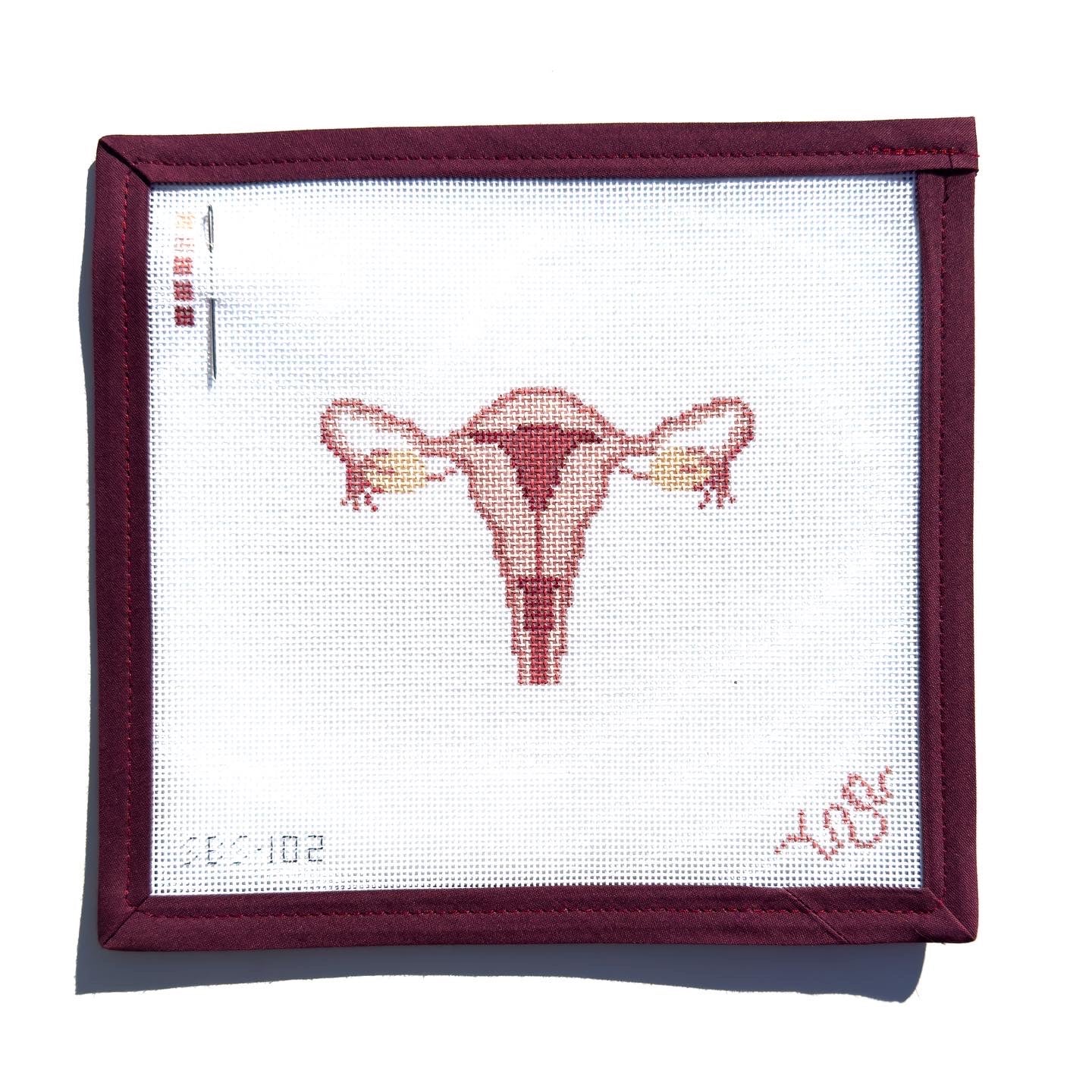 This needlepoint canvas is 3x4" on 18 mesh. This design depicts the internal, cross-section view of the organ, commonly shown in textbooks and other artistic renderings. Both versions of the uterus design are the same size to allow for double sided finishing.