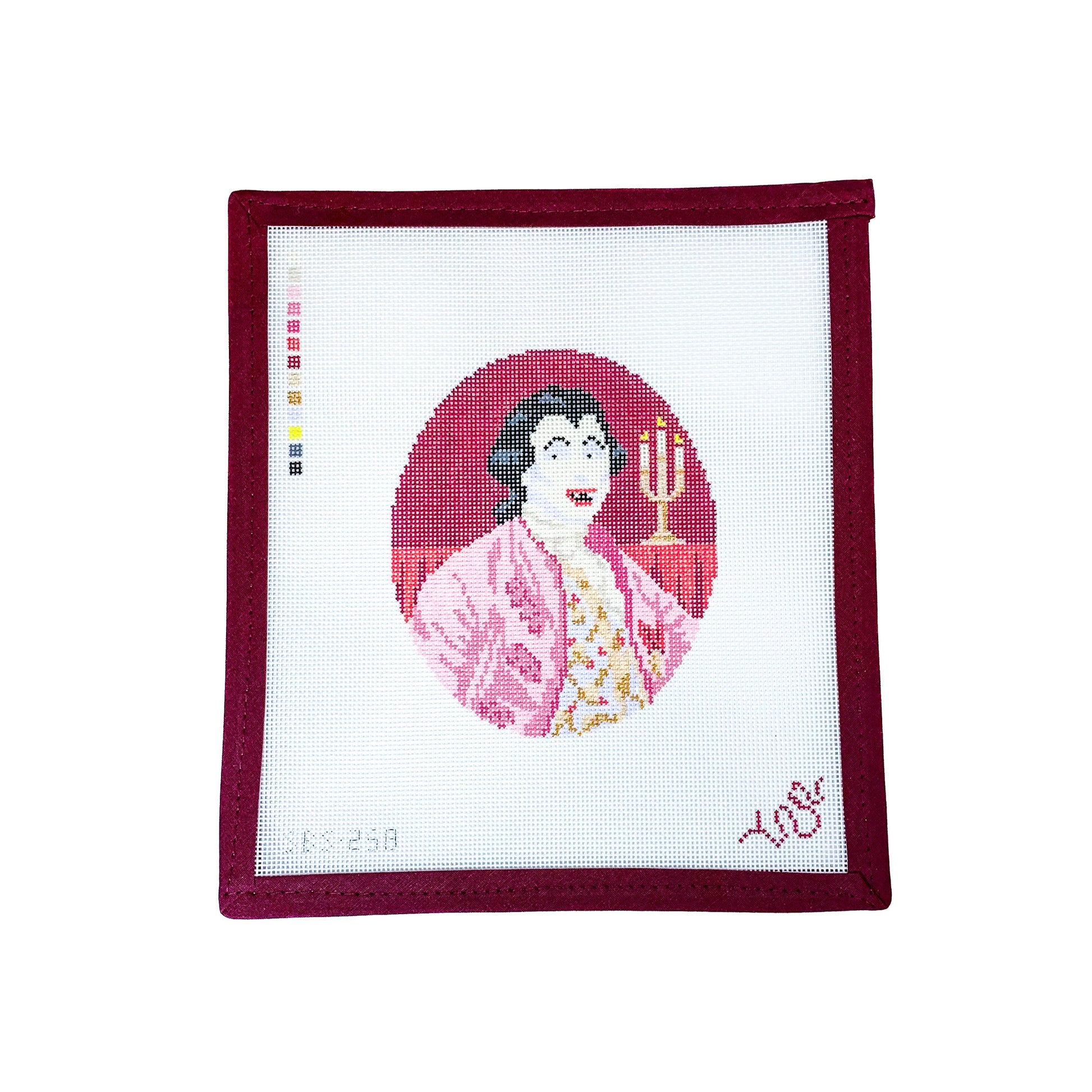 Canvas hand painted and stitch painted onto a 4x5" oval on 18 mesh.